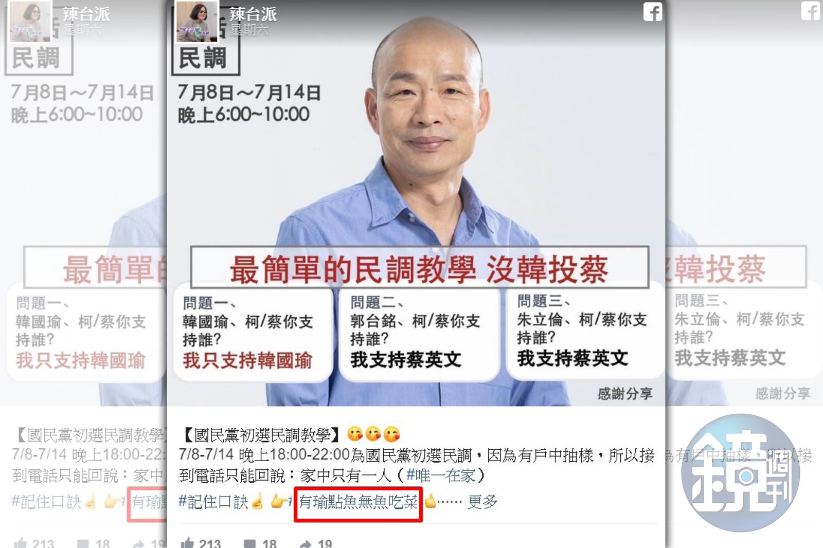 本刊調查,有英系幕僚在個人臉書發文,擬定教戰手冊,指國民黨初選民調因為有戶中抽樣,所以支持者在接到電話時,只能說「家中只有一人(唯一在家)」,且被問到對比及互比民調時,回答方式要依循「有瑜點魚、無魚吃菜」方式,力挺韓國瑜初選過關。