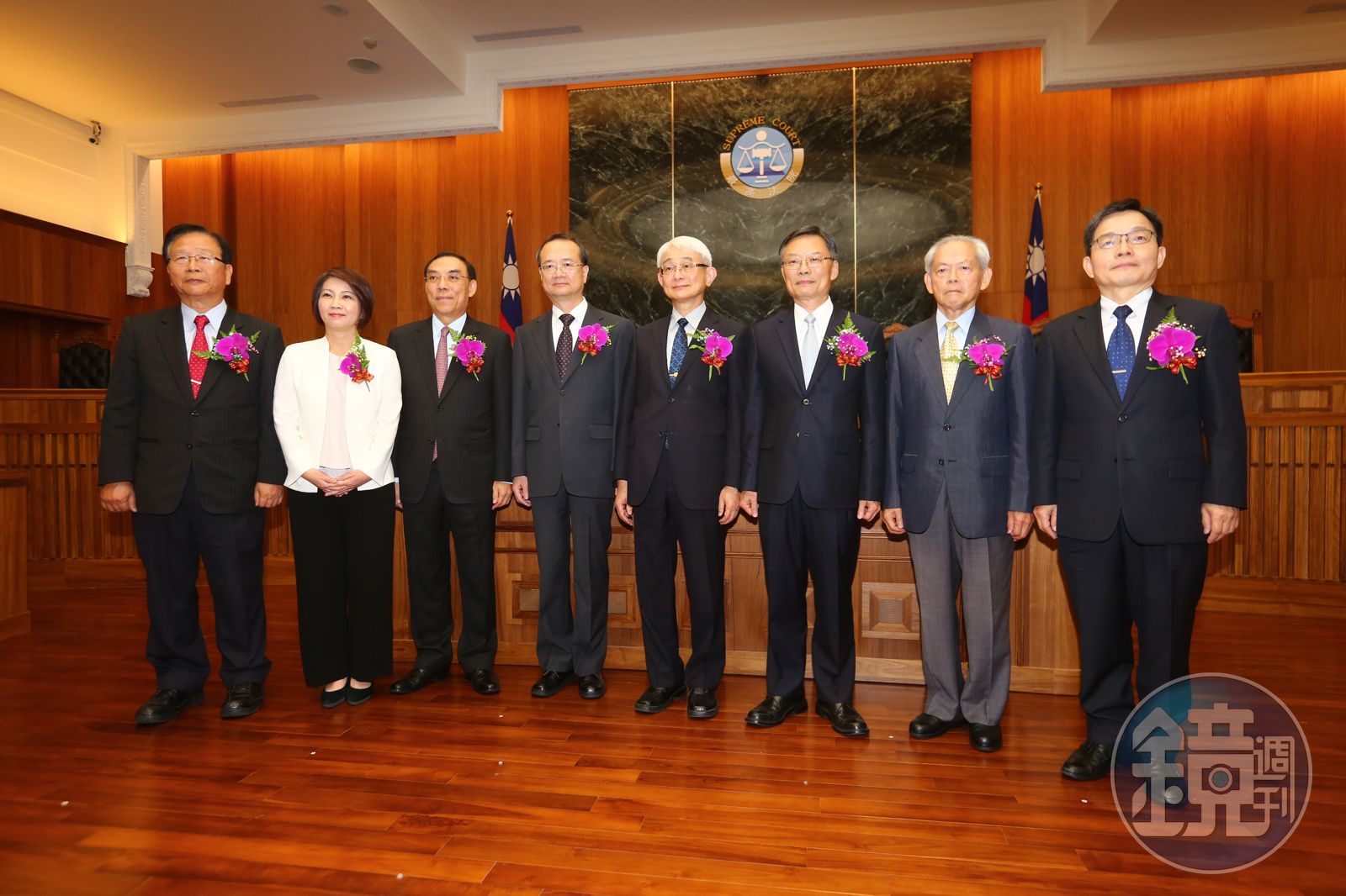 最高法院今舉行大法庭揭牌,立委林德福、周春米、法務部長蔡清祥、司法院長許宗力、最高法院院長鄭玉山、檢察總長江惠民、法律扶助基金會董事長范光群、律師公會全國聯合會理事長李慶松等人出席揭牌儀式。