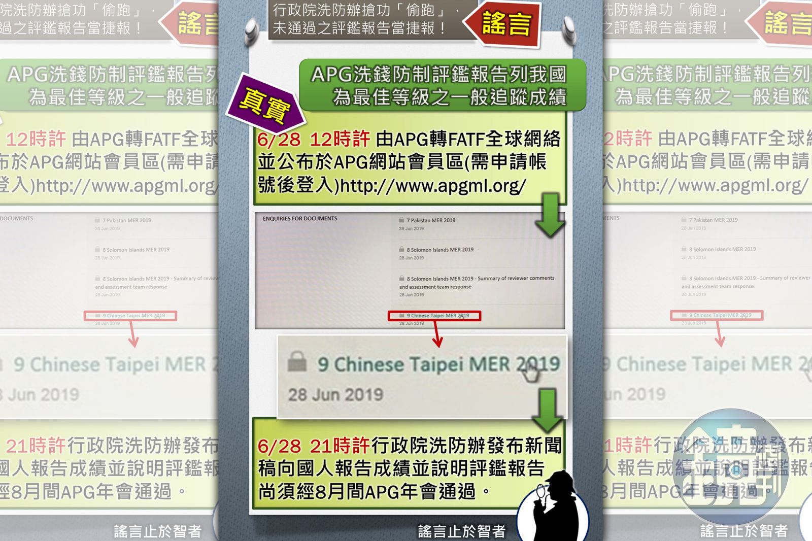 一、APG對我國洗錢防制第三輪相互評鑑報告,已於108年6月28日公布,由APG轉FATF全球網絡,並公布於APG網站會員區http://www.apgml.org(需申請帳號後登入)。本辦公室秉持專業立場,依評鑑報告於同日適時發布新聞,絕非APG未公布報告而洗防辦「偷跑」云云。