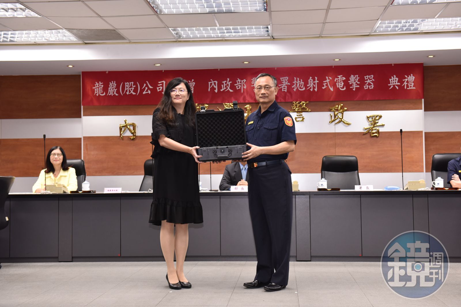 昨(8月2日)下午2點,龍巖股份有限公司執行副總詹淑娟前往警政署,親自贈與430支拋棄式電擊槍給警政署長陳家欽,現場並有技術教官示範「電擊器專用測試靶紙」情境模擬射擊,希望能給予員警最妥善的訓練,以應付突發狀況。