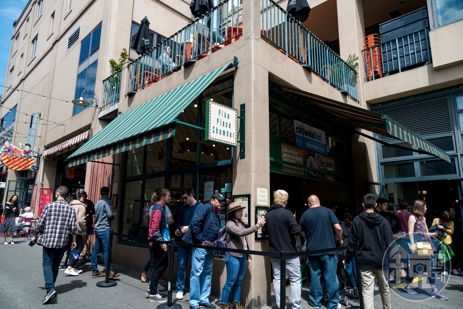 到了午餐時間,很多人會去市場對面的人氣店「Pike Place Chowder」排隊,點「Make it a sample」可同時喝到四種口味巧達湯。其實這條POST ALLEY巷子裡有很多有意思的小店與餐廳,在當地評價都不錯,如果有時間,應該多去探險一下,發掘觀光客少去的小店,像是隱藏在巷尾的「Pink Door」就是人氣頗高很難訂位的一家店。當然這裡也有海鮮店,想吃最新鮮的生蠔、蛤蠣都不是問題。
