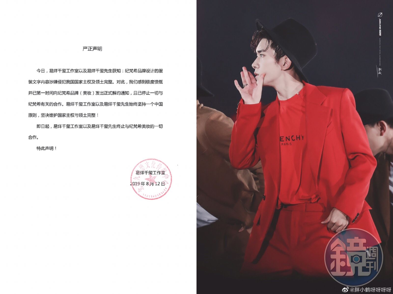 TFBOYS成員易烊千璽急切割GIVENCHY,宣布終止合作。(翻攝自微博)發布時間:2019.08.12 15:25 臺北時間
