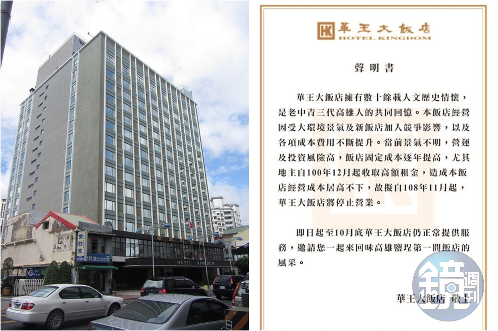 華王大飯店22日晚間發表聲明,表示受大環境、新飯店競爭影響,各項成本費用不斷提升,當前景氣也不明,且地主從2011年12月起收取高額租金,飯店經營成本因而居高不下,擬自11月起停止營業,並強調11月前仍接受訂房、訂桌。
