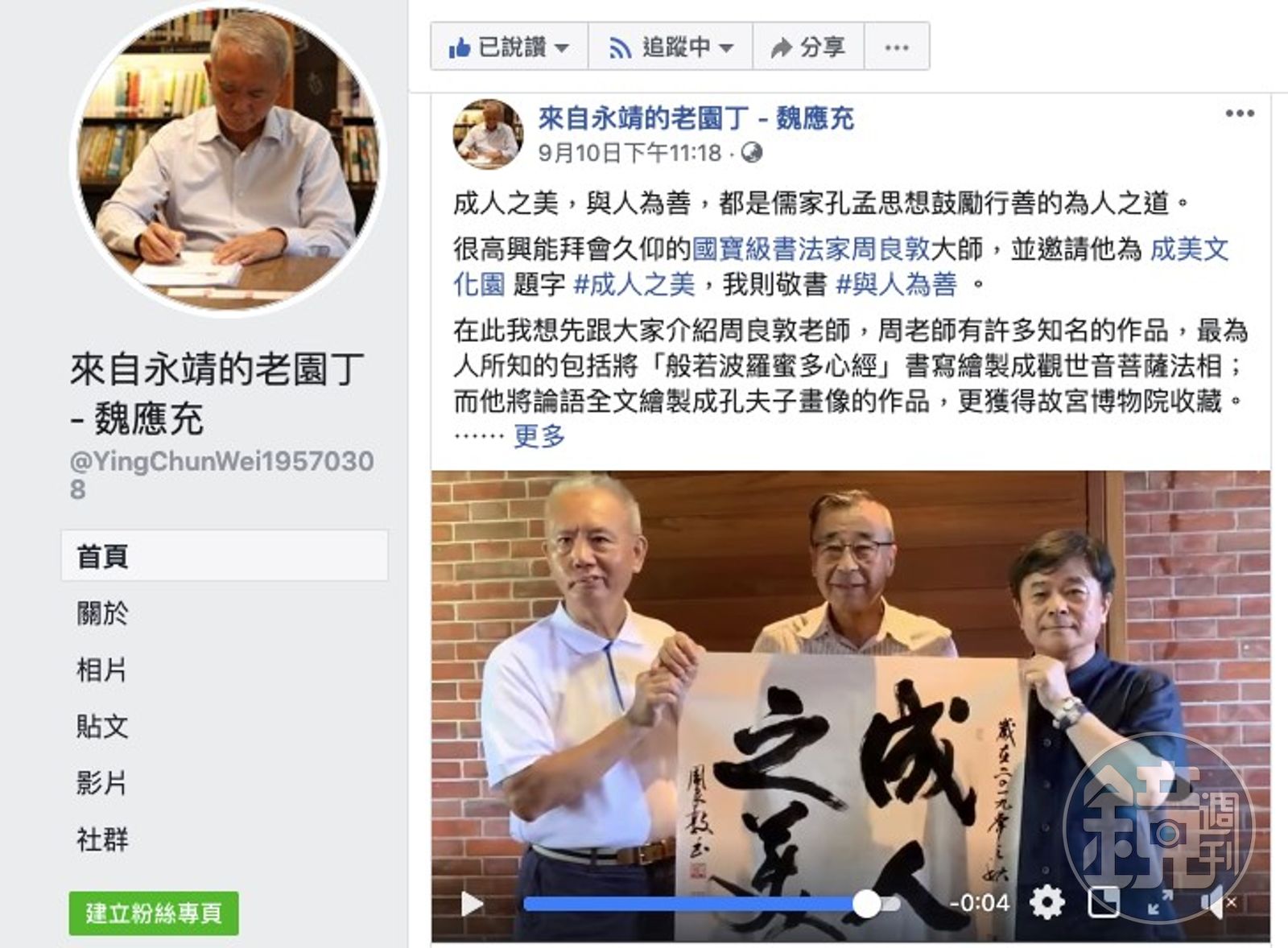 魏應充與周良敦相見歡,是因為邀請周良敦為成美文化園題字,因此影片中可以看到周良敦當場揮毫「成人之美」,而魏應充則是寫下「與人為善」作為呼應。魏應充表示,「成人之美,與人為善,都是儒家孔孟思想鼓勵行善的為人之道。」