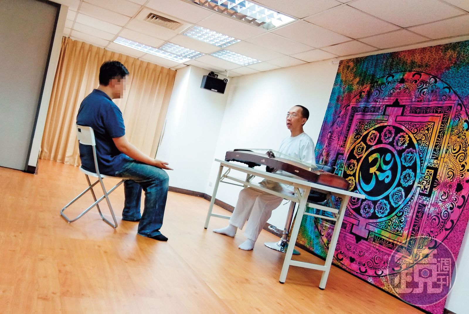 接著,許男拿出壓箱寶-藏傳法器「丁夏」和「頌缽」,丁夏即中文裡的鈸,頌缽則是金屬製碗公,許男稱這些法器都經過加持,具有療癒功能,但記者依舊無感,反而是耳膜因許男在耳邊狂敲法器,被震得疼痛不已。