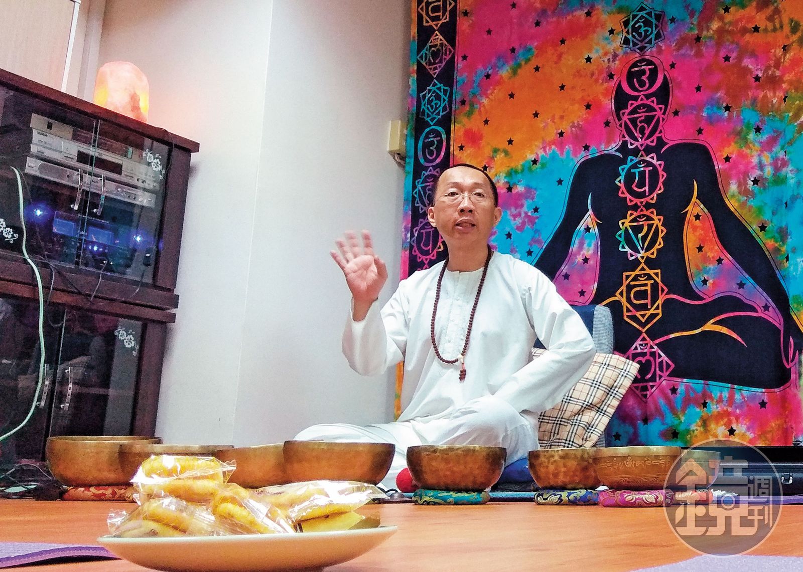 自稱能量大師的許台融端坐頌缽後,向學員講解疾病產生原理。發布時間:2019.10.01 06:58 臺北時間