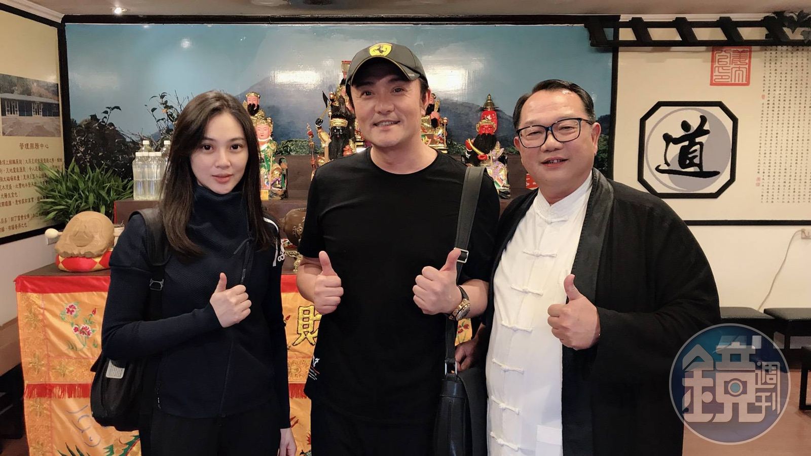 李㼈夫妻參拜陽明山姜太公道場,道場主席羅世新(右)邀其擔任七星燈大法會暨羅府王爺安座大典主醮官。(翻攝畫面)發布時間:2019.11.01 15:14 臺北時間