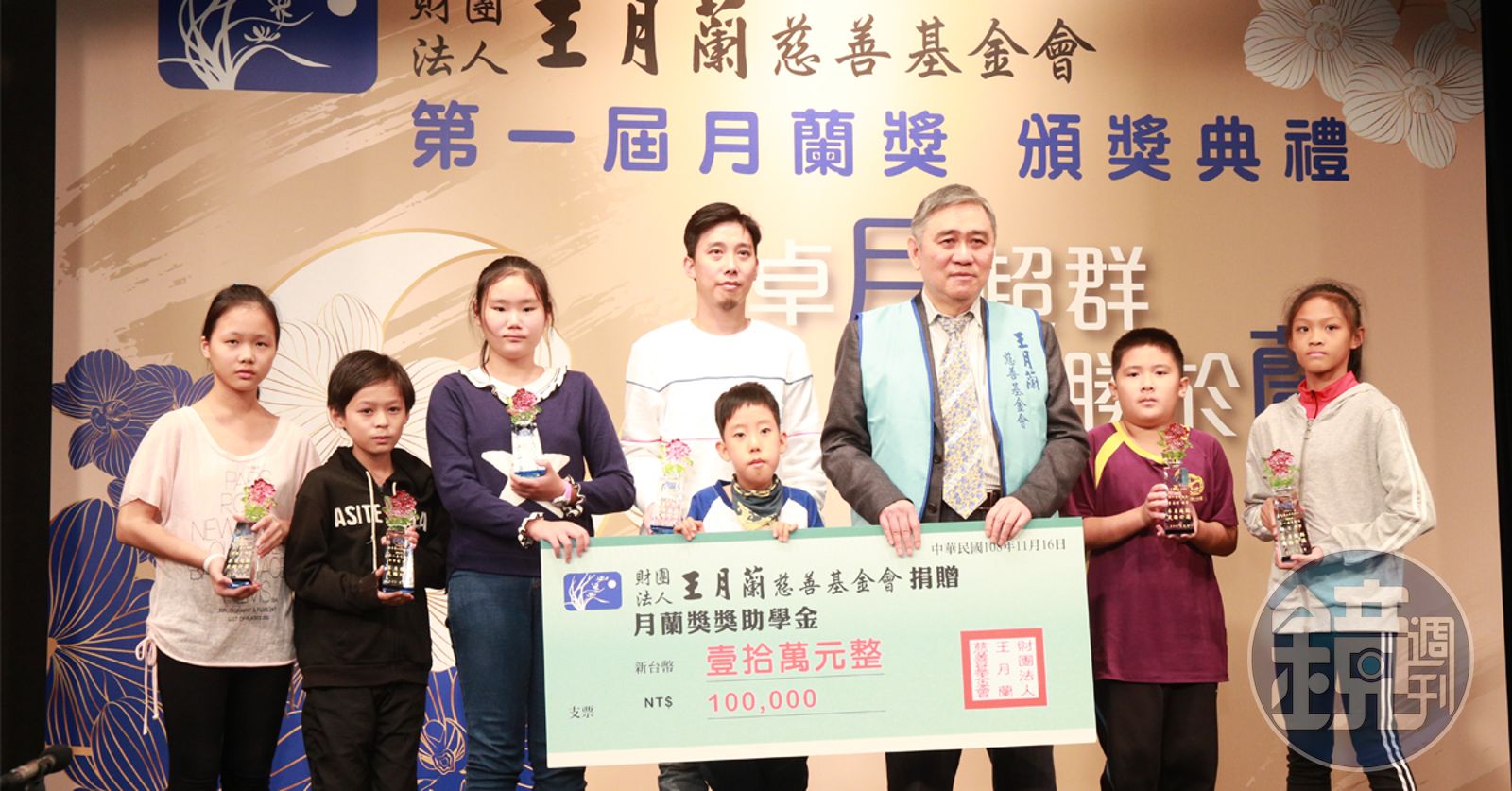 財團法人王月蘭慈善基金會董事長王文洋與第一屆月蘭獎得獎小學生合影,得獎者自左至右為李甜心、曹富蓉、陳彥叡、呂承洋、屠胤嘉小朋友。