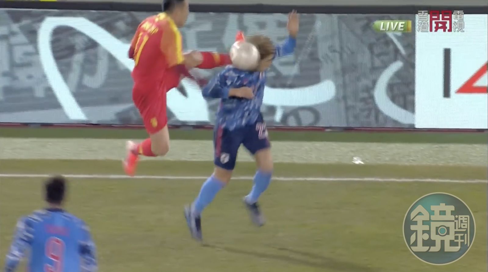 中國球員姜至鵬在球賽進行至上半場31分鐘時,在搶球過程竟直接伸出「鬼腳」狠踹日本球員橋岡大樹的後腦勺,橋岡大樹痛得當場抱頭倒地,許久都未能起身,裁判卻止給了姜至鵬黃牌。所幸經檢查後,橋岡大樹並無大礙,能繼續進行賽事。