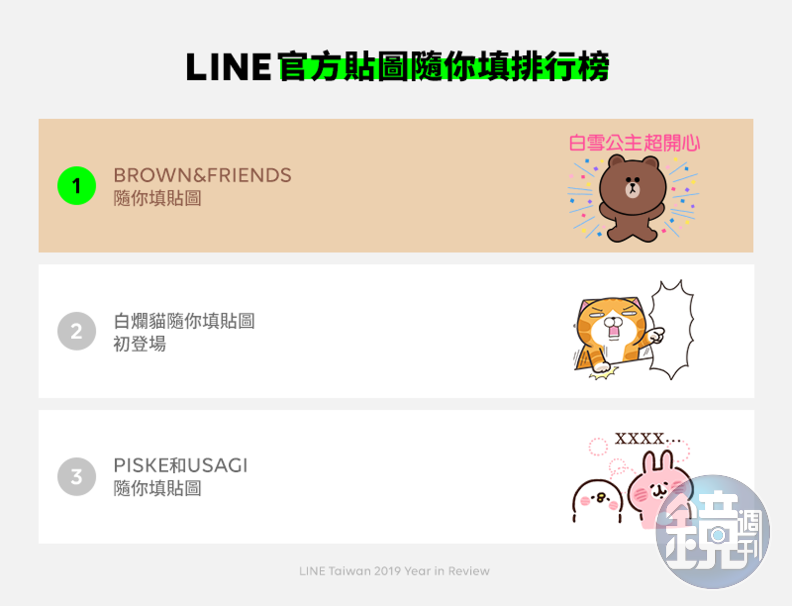 隨你填貼圖的全球榜單冠軍,由「熊大&兔兔 BROWN&FRIENDS 」奪得,本土創作者作品「白爛貓」奪下全球榜單第二名,第三名則是由卡娜赫拉作品「Piske 和 Usagi」獲得。