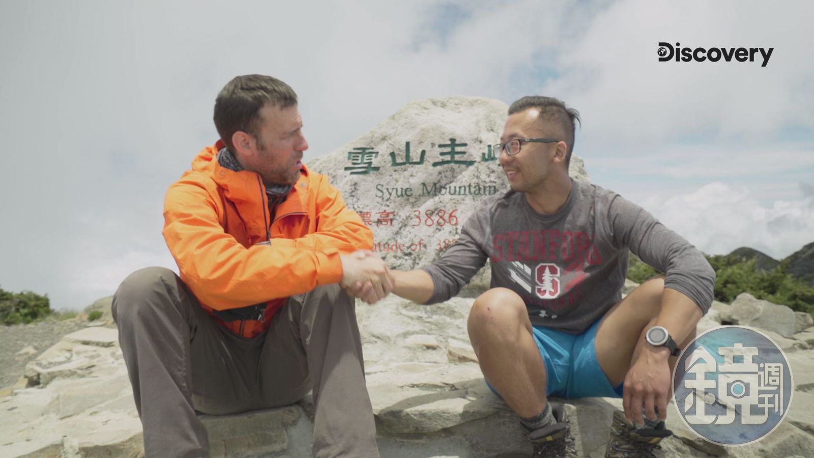 來自加拿大的探險家白銳勻(左),在專業人士的陪同下,完成聖稜線縱走,登上雪山主峰。(Discovery頻道提供)