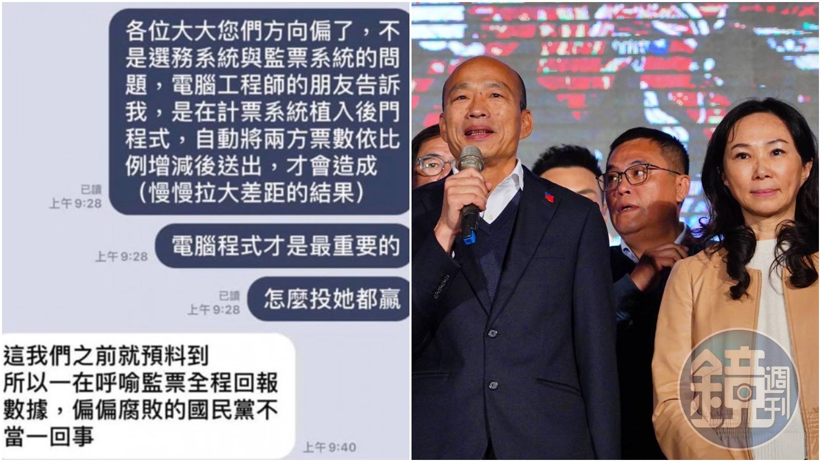 即便中選會和台灣事實查核中心各種闢謠,仍有不甘心的韓粉在「挺韓五虎將」杏仁哥粉專及各大挺韓社團貼上Line對話截圖,「各位大大您們方向偏了,不是選務系統與監票系統的問題,電腦工程師的朋友告訴我,是在計票系統植入後門程式,自動將兩方票數依比例增減後送出,才會造成慢慢拉大差距的結果」、「電腦程式才是最重要的」「怎麼投她都贏」「這才是要命的關鍵,台灣再度被竊國了」。