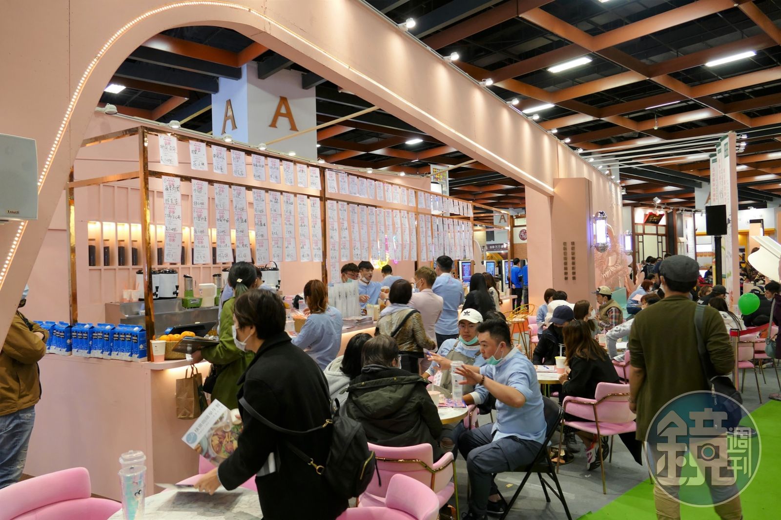 網紅手搖飲舒油頭在加盟展場打造粉紅派對,首日簽約即有40單,4天簽下超過150單。(台灣連鎖加盟促進協會提供)