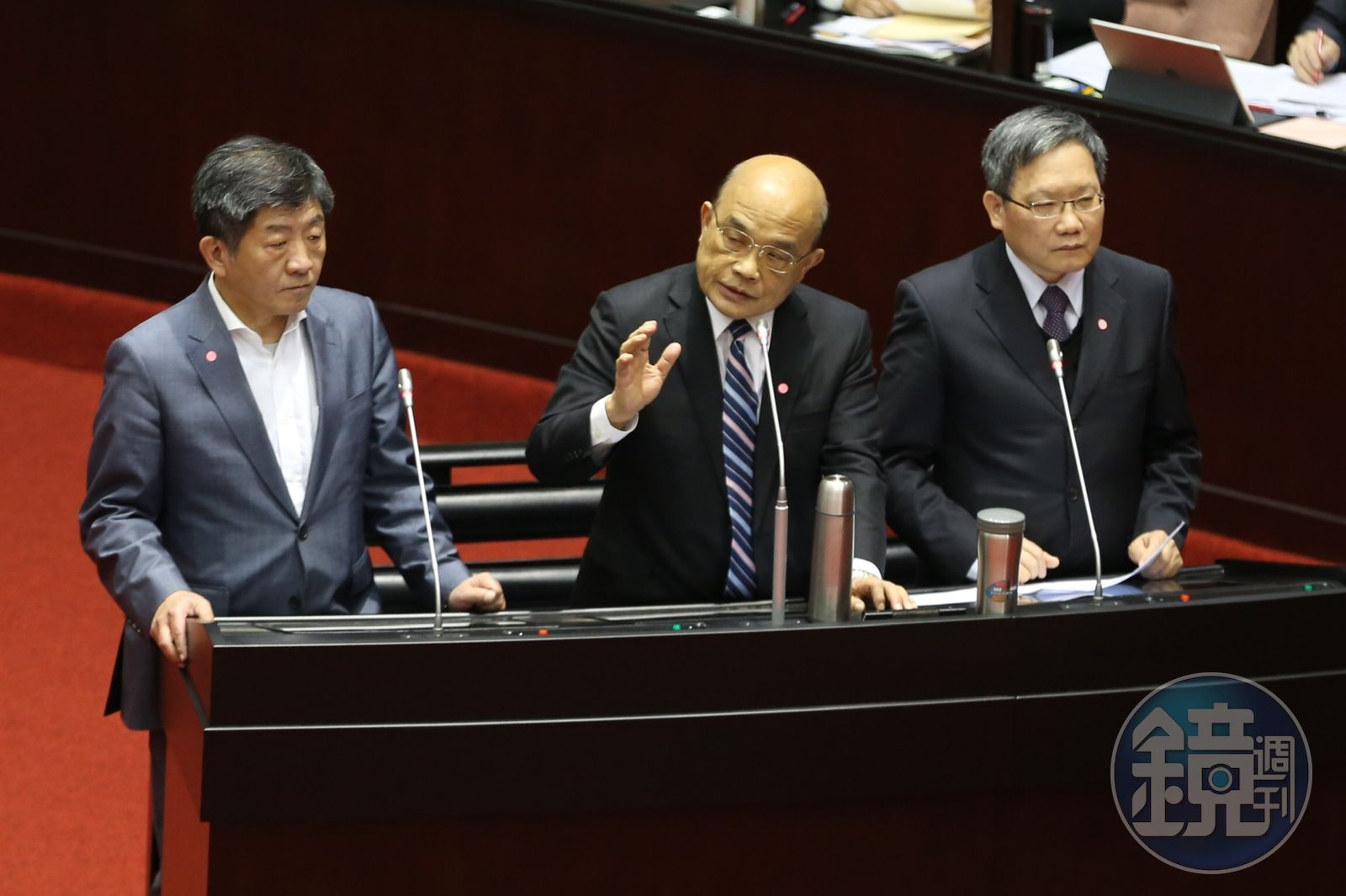 行政院長蘇貞昌(中)、衛福部長陳時中(左)、財政部長蘇建榮答詢。