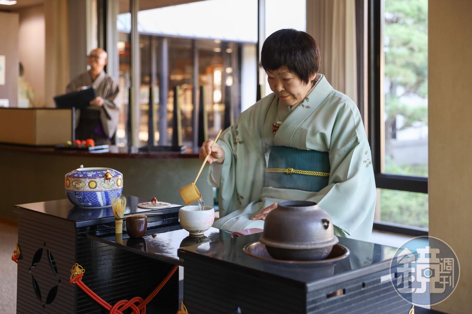 我們一邊看著茶師快速地打著茶湯,一邊聽茶師村田宗代解說:「茶湯有濃淡之分,大家剛剛品嘗的是淡茶,裏千家的作法是把泡打出來,所以打得很快速,如果是濃茶,會有3到4個人分享一碗茶湯,茶筅就不是用振動的作法,而是用揉捻的,才能做出濃稠的茶湯,讓3個人一起分享,淡茶的話才需要快速的振動。」