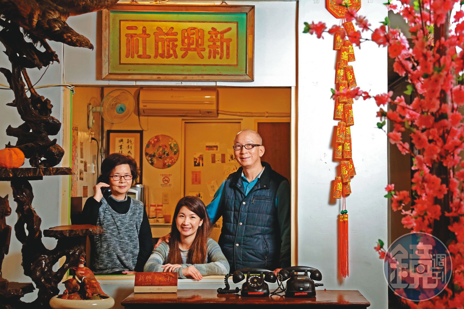 新興旅社是1棟4層樓高的建築,屋內有1座紅色鐵欄杆的天井。劉秋菊拉著我們參觀,內部擺放了許多50年起跳的古董,如2樓1台古早的手搖式電話,而走廊下的3盞奶油燈,更是從開業第1天照亮至今超過70年。另一處牆面則貼滿了旅客的留言,「你看這個人,他每年都回來苗栗拜天公,已經連續來住了13年。」劉秋菊細數著每張留言的故事,「這張是1位來自日本的沖繩人,10年前他就來住了。」