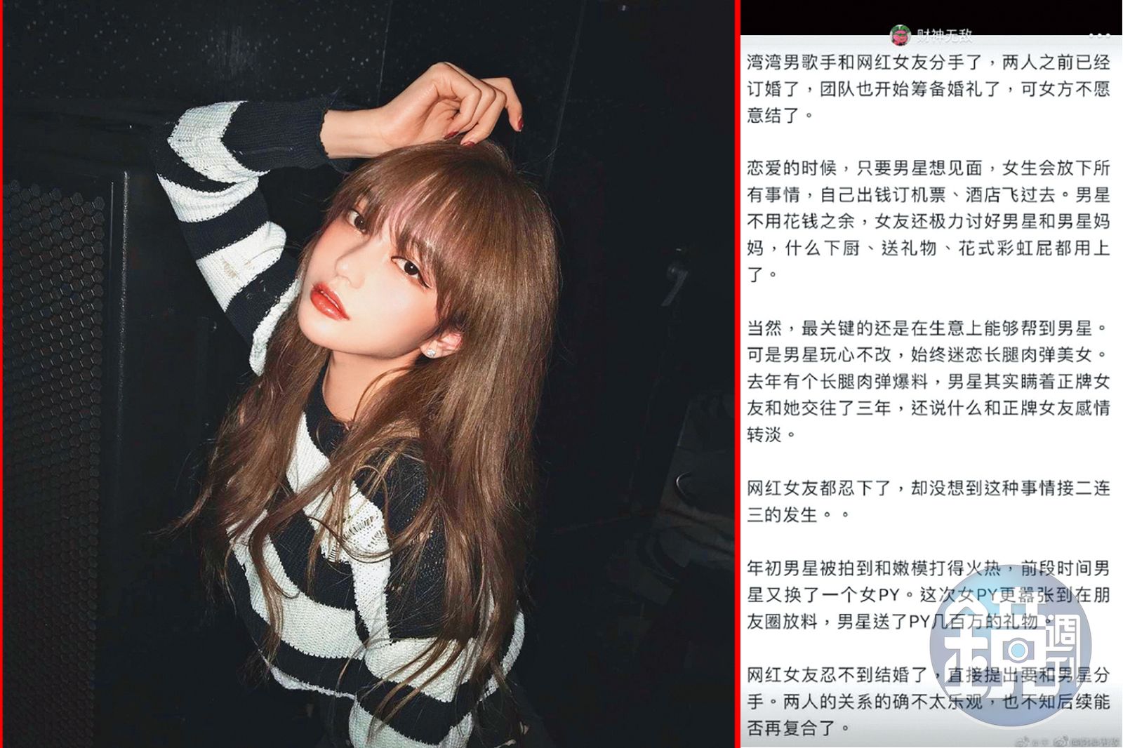 周揚青與羅志祥近年常在微博互動曬愛,一度被認為是下一對結婚的佳偶。(翻攝自周揚青微博)爆料文中,直指交往時,女方會放下手上的一切事情,飛到台灣陪伴男方,且還下廚、送禮,一一收服男方媽媽及男友身邊一干好友的心,連帶在生意上,也幫了男方不少;內文更提到女方全心全力支持男友,但傳出男方的女人緣太好,導致女生不爽。