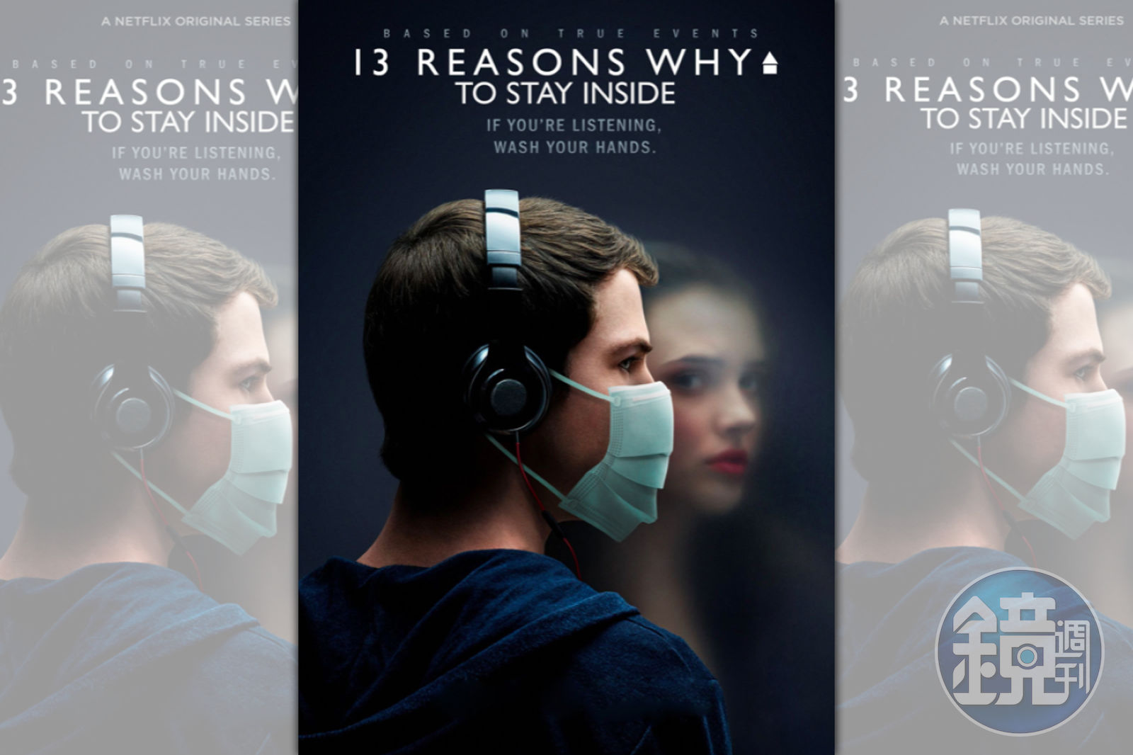 《漢娜的遺言》(13 Reasons Why),男主角多了口罩,變成了「漢娜的遺言:待在家」。(翻攝自Boss Logic官方推特)發布時間:2020.03.24 21:44 臺北時間