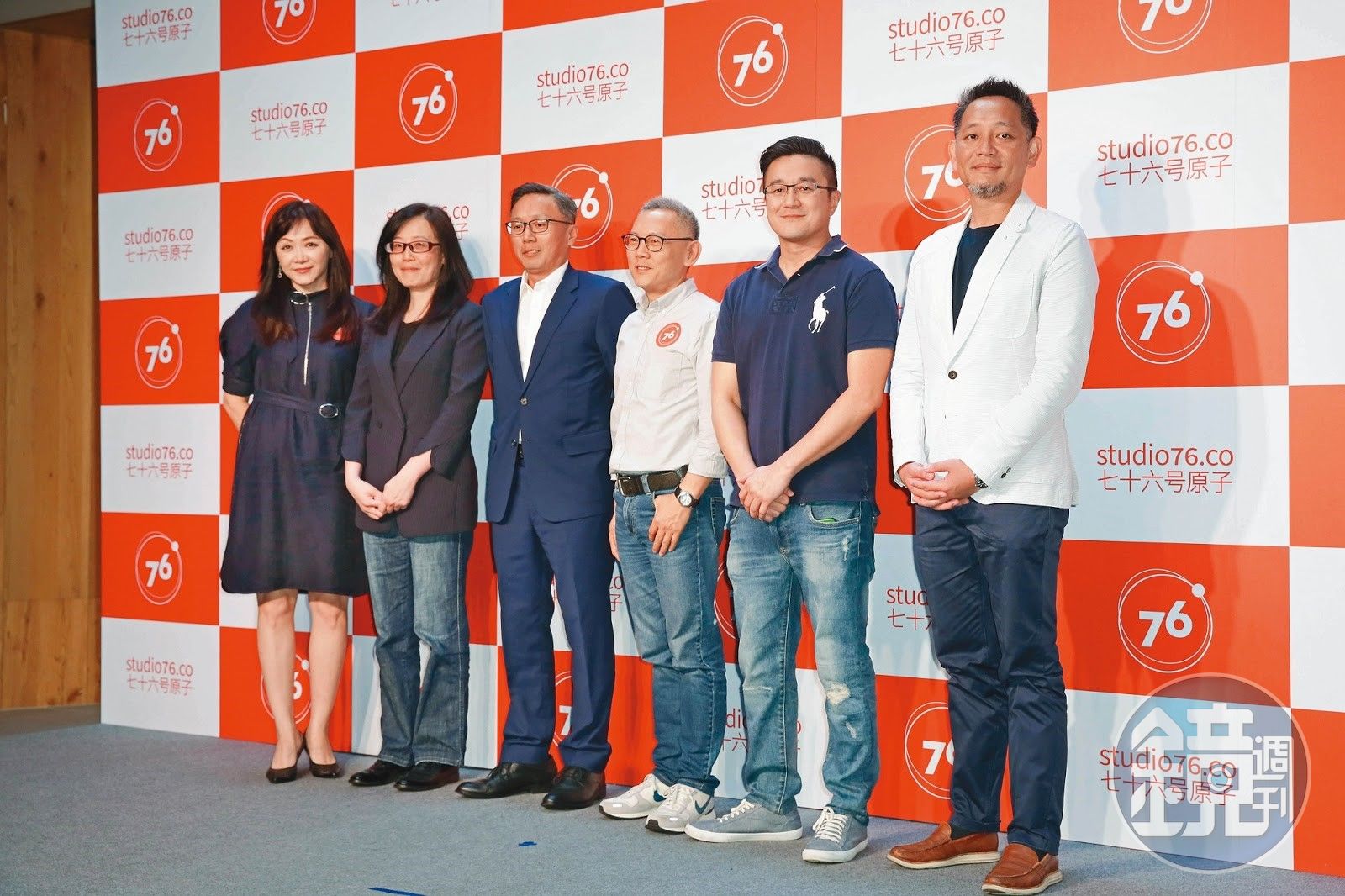七十六号原子董事總經理楊志光(右三),邀請台灣大哥大副總劉麗惠(左一起、凱渥董事總經理宣美齡、電通安吉斯集團總經理盧炳勳、KKFARM總裁黃凱偉(右二起)、貴金影業總經理楊中天等投資人加入。
