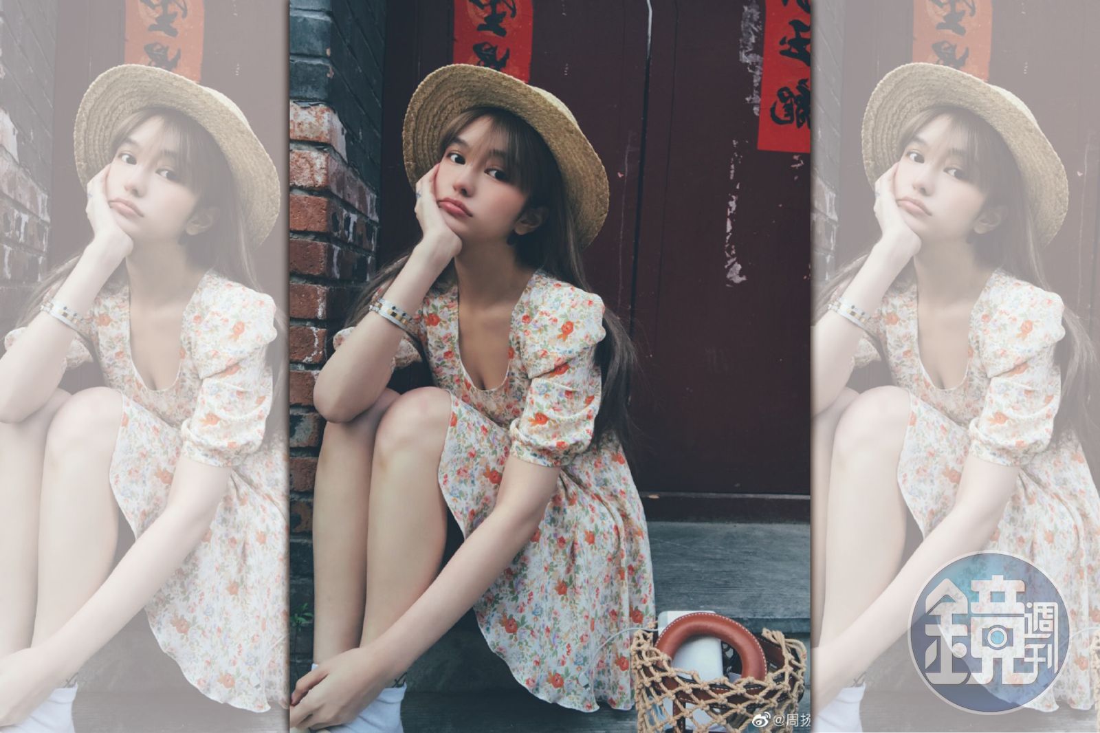 周揚青於今中午在微博中分享露乳溝的性感美照,並寫:「今天帶大家遊覽北京的胡同。」(翻攝自周揚青微博)發布時間:2020.04.07 18:54 臺北時間