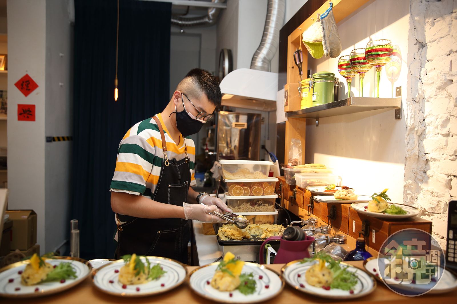 採訪這天,晚上有一組20人的包場活動,李俊頡下午4點就在廚房內忙進忙出。無菜單料理大量使用符合春天時節的艾草,從前菜沙拉到主餐、甜點,都由他親自發想。