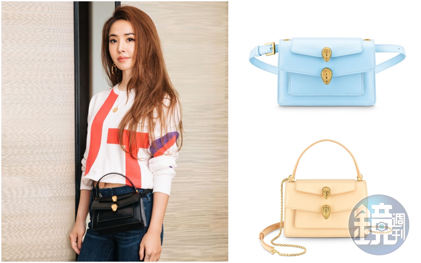 美國女歌手兼模特兒Faith Lynch配戴全新Alexander Wang X BVLGARI Serpenti Forever蜜桃橘色小牛皮三用包。(寶格麗)