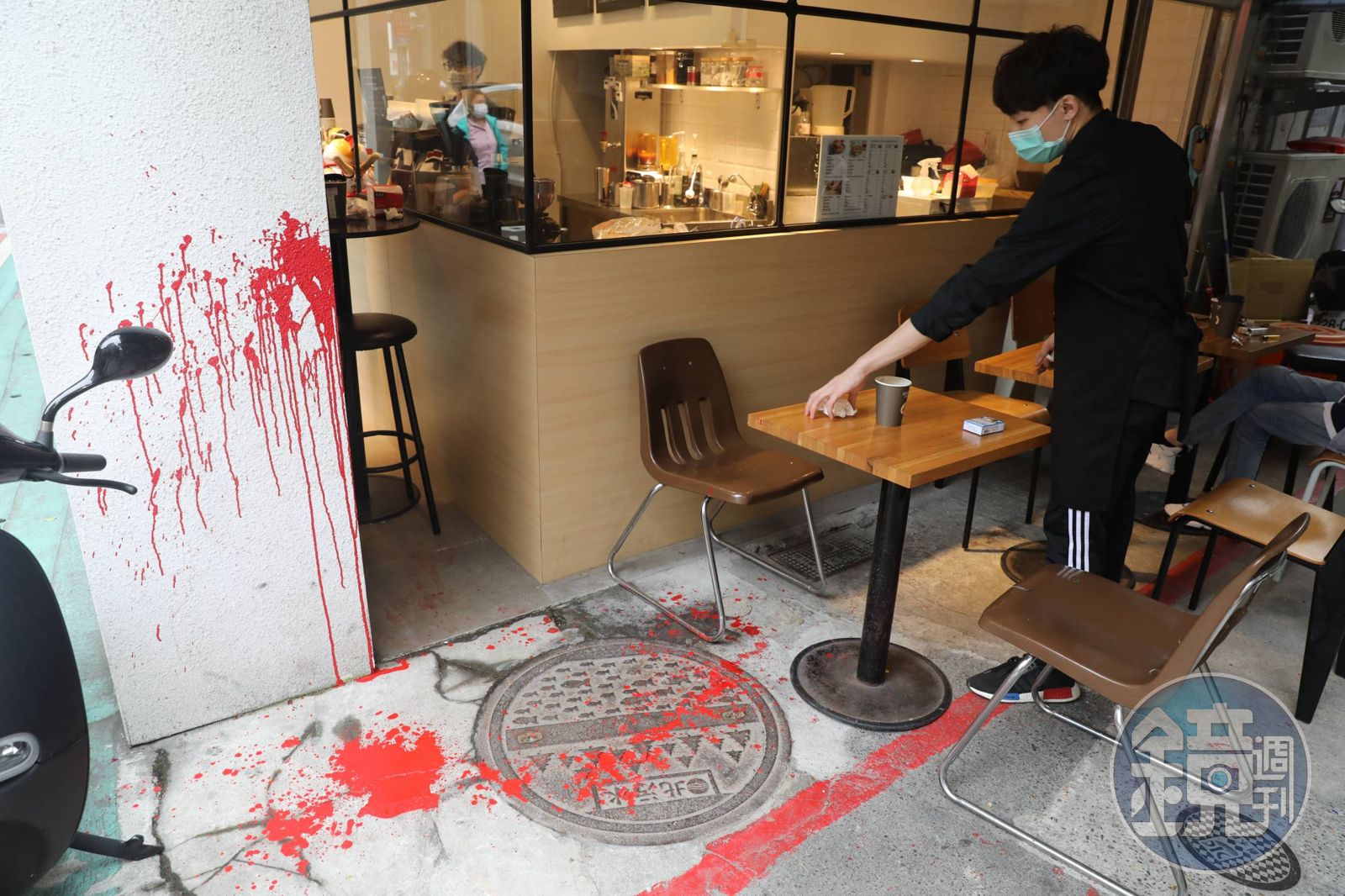 前香港銅鑼灣書店店長林榮基今早遭到不明人士潑漆。(翻攝畫面)警方表示,林榮基今日上午8時50分在新書店附近的咖啡廳用餐時,1名頭戴鴨舌帽及口罩的男子突然靠近,並拿飲料杯對林榮基潑灑紅漆,所幸林未受傷,林榮基在簡單清理後立即向警方報案。