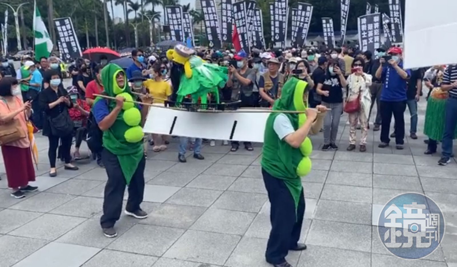 今日一早在典禮開始之前,就有獨派團體先到自由廣場前集合,指控蔡英文學歷造假,要求蔡英文下台。抗議民眾除了舉旗嗆蔡英文,還準備了類似轎子的台座,上頭放了掛有蔡英文肖像的玩偶,一旁還放起網路流行的「黑人抬棺舞」音樂,2個人抬著轎子大跳抬棺舞,中途玩偶還不慎掉落,場面有些尷尬。他們諷刺蔡英文是「一代女皇」要登基,痛批蔡英文獨裁如古代皇帝。