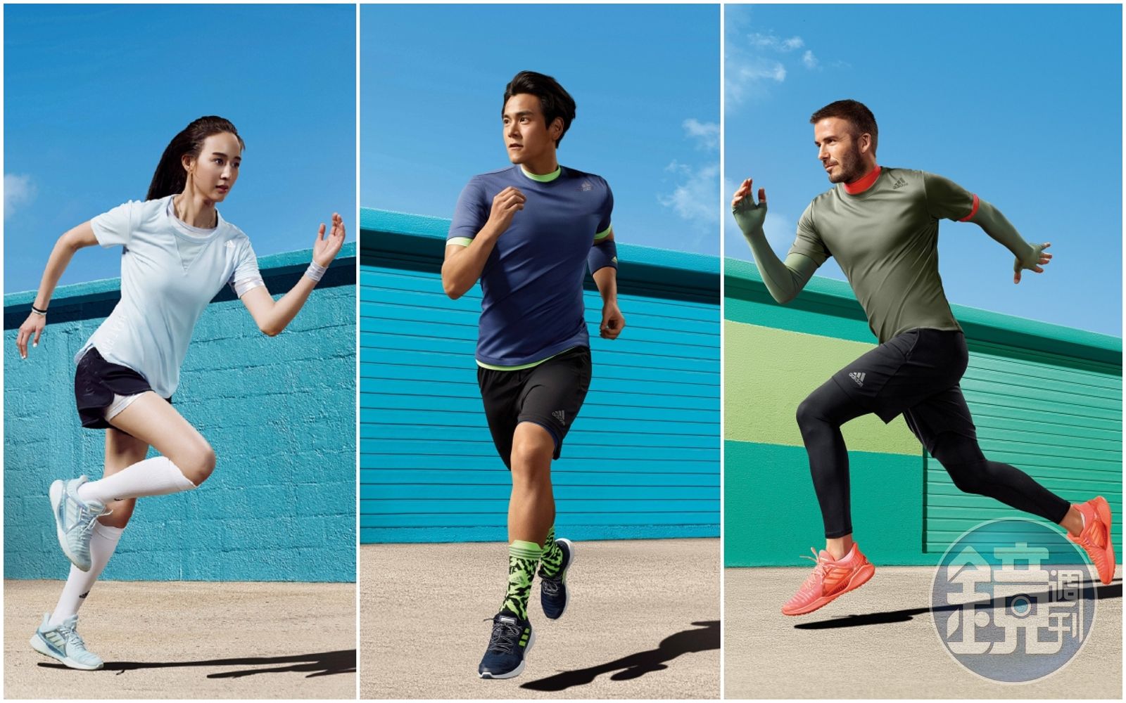 (左起)張鈞甯、彭于晏、貝克漢分別以代言人身份,穿上CLIMACOOL跑鞋拍攝形象廣告。(adidas提供)發布時間:2020.05.24 20:53 臺北時間