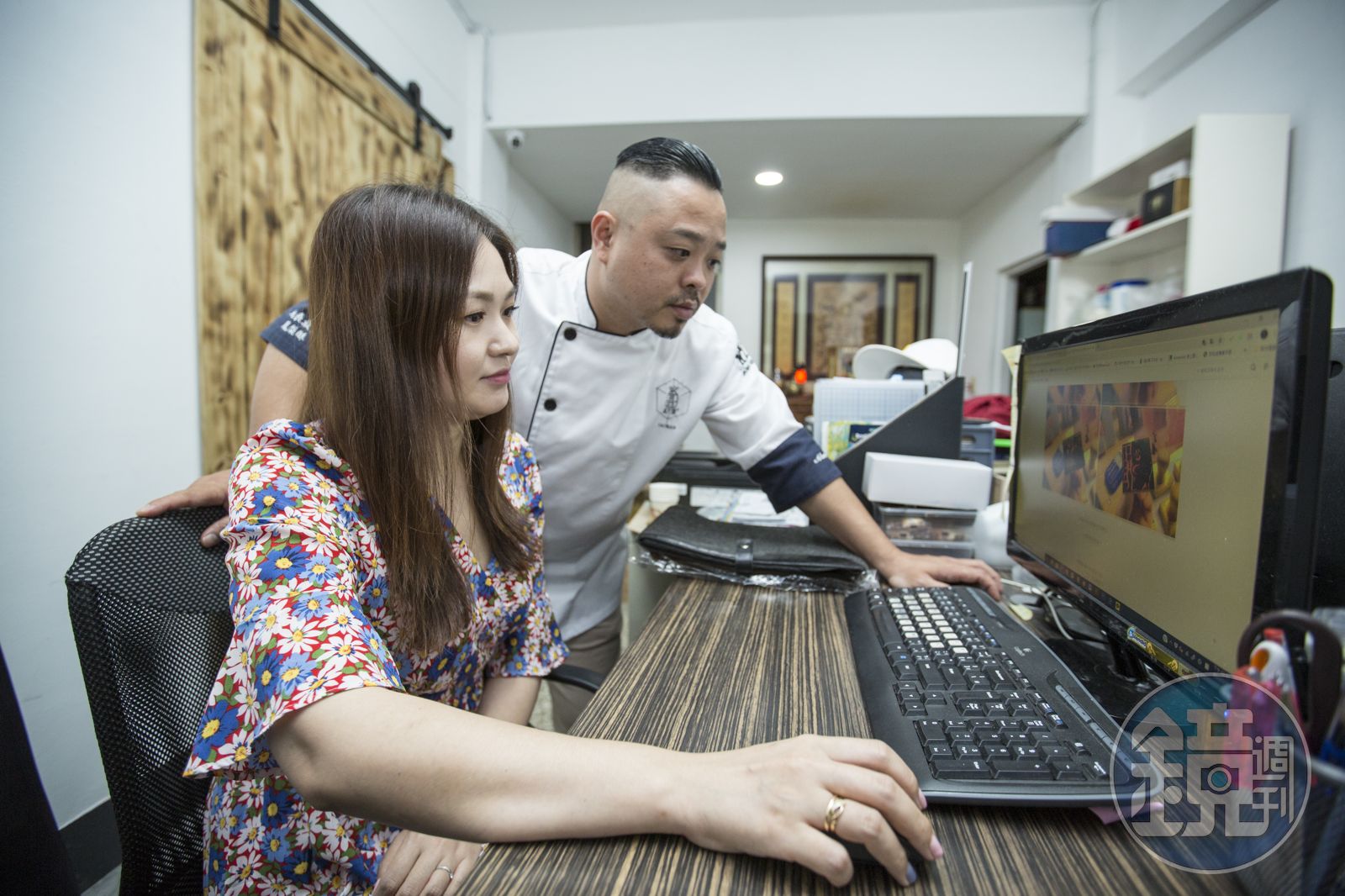 「高女婿」總店的空間不大,幾張桌子、電腦與預備出貨的箱子幾乎就塞滿了整間辦公室。走進辦公室,高吉良和韓國籍的太太徐知賢正在聯繫韓國客戶,今年受到武漢肺炎疫情影響,觀光客無法來台,他們決定主動出擊,由太太負責韓國的線上銷售平台。