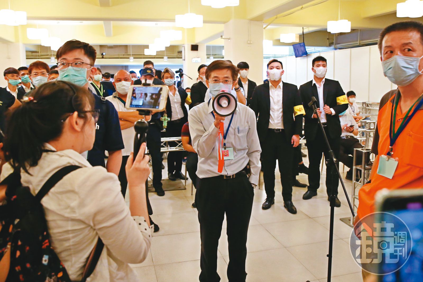 大同股東會當天,公司派逕自刪除「非公司派陣營」股東的投票權,現場引發糾紛,只見林郭文艷高坐主席台上,與股東隔著至少5層由黑衣人組成的人牆,面對台下各種質疑、批評,全是同一句回應:「我們請下一位股東發言。」