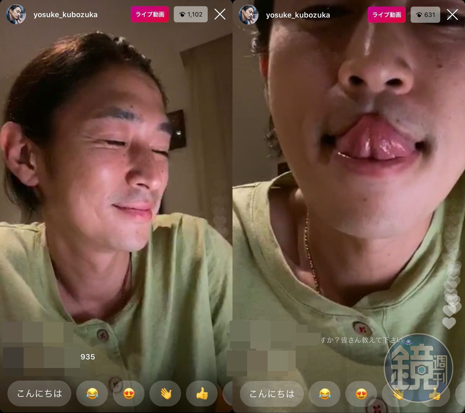 窪塚洋介一邊直播一邊喝酒,越喝情緒越嗨,不時隨著音樂擺動,還介紹起自己喝的是什麼酒,一時興起竟開啟「撩人模式」,舔舌、嘟嘴,掀開上衣露出乳頭,還站起來拉下褲頭讓恥毛在鏡頭前透氣,線上觀看的一千多名粉絲全都欣賞了這場半夜福利。