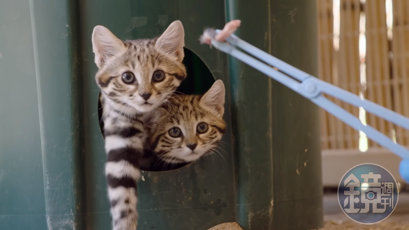保育員俯臥在地,用鉗子夾住碎肉,試圖將史凱勒和萊德從洞穴裡引出來,引導牠們吃下「貓生」第一塊肉。只見兩隻小貓謹慎地觀察許久,靠近聞了幾下才將肉咬走,開心享用。聖地亞哥動物園野生動物護理專家戴維斯(Chelsea Davis)表示,使用鉗子可以避免被黑足貓咬傷,也讓黑足貓可以與人類保持舒適的距離。