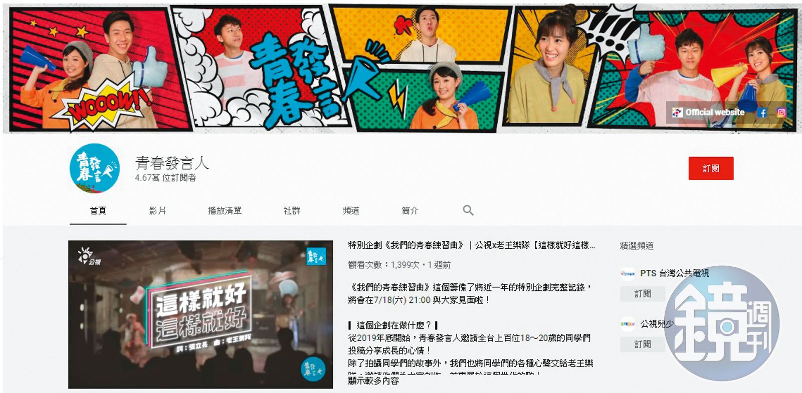 《青春發言人》連年入選紐約電視獎、美國聖地牙哥國際兒童影展等獎項,今年〈我的彩虹家庭〉及〈國族認同〉2支主題影片,更分別入選德國慕尼黑兒少影展、世界公視大展INPUT,展現台灣青少年對時事的關心和思考方式。