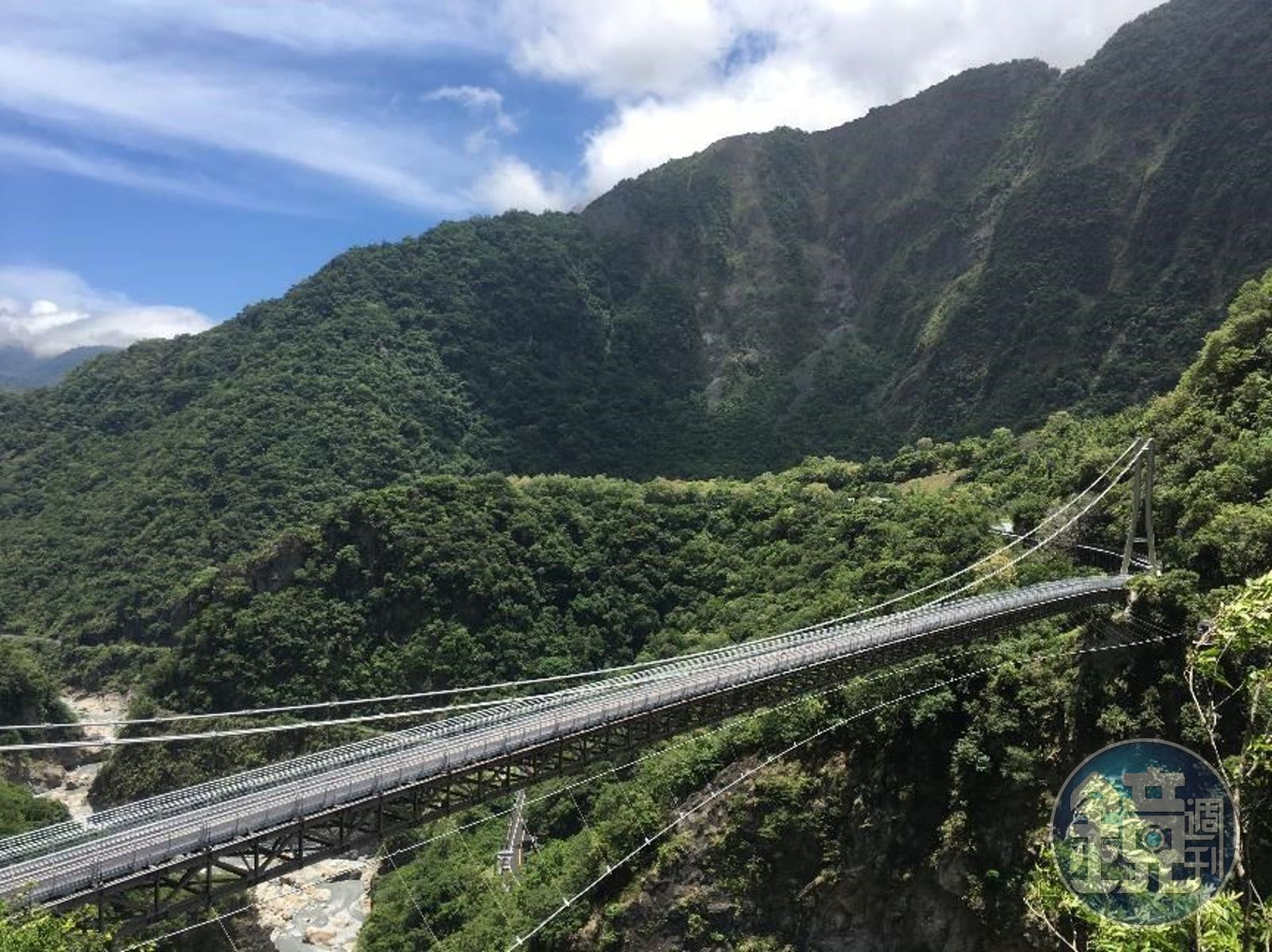 山月吊橋跨越太魯閣國家公園立霧溪,連接錐麓巴達岡和布洛灣台地,全長196公尺,橋面距溪底153公尺、寬度2.5公尺,是國內深跨比最高的峽谷吊橋,可欣賞360度的壯麗峽谷風光。