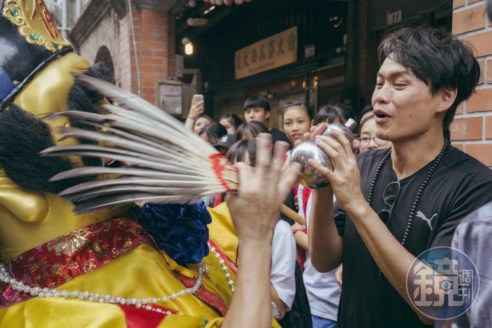 遶境隊伍經過時,濟公還賜酒給黃鐙輝,將酒杯給他示意喝下。黃鐙輝笑說,「我當下真的蠻驚喜的,雖然只碰杯口做個意象,但有種醍醐灌頂的感覺。但我事後想想,才發現我好像跟濟公間接接吻了!」。