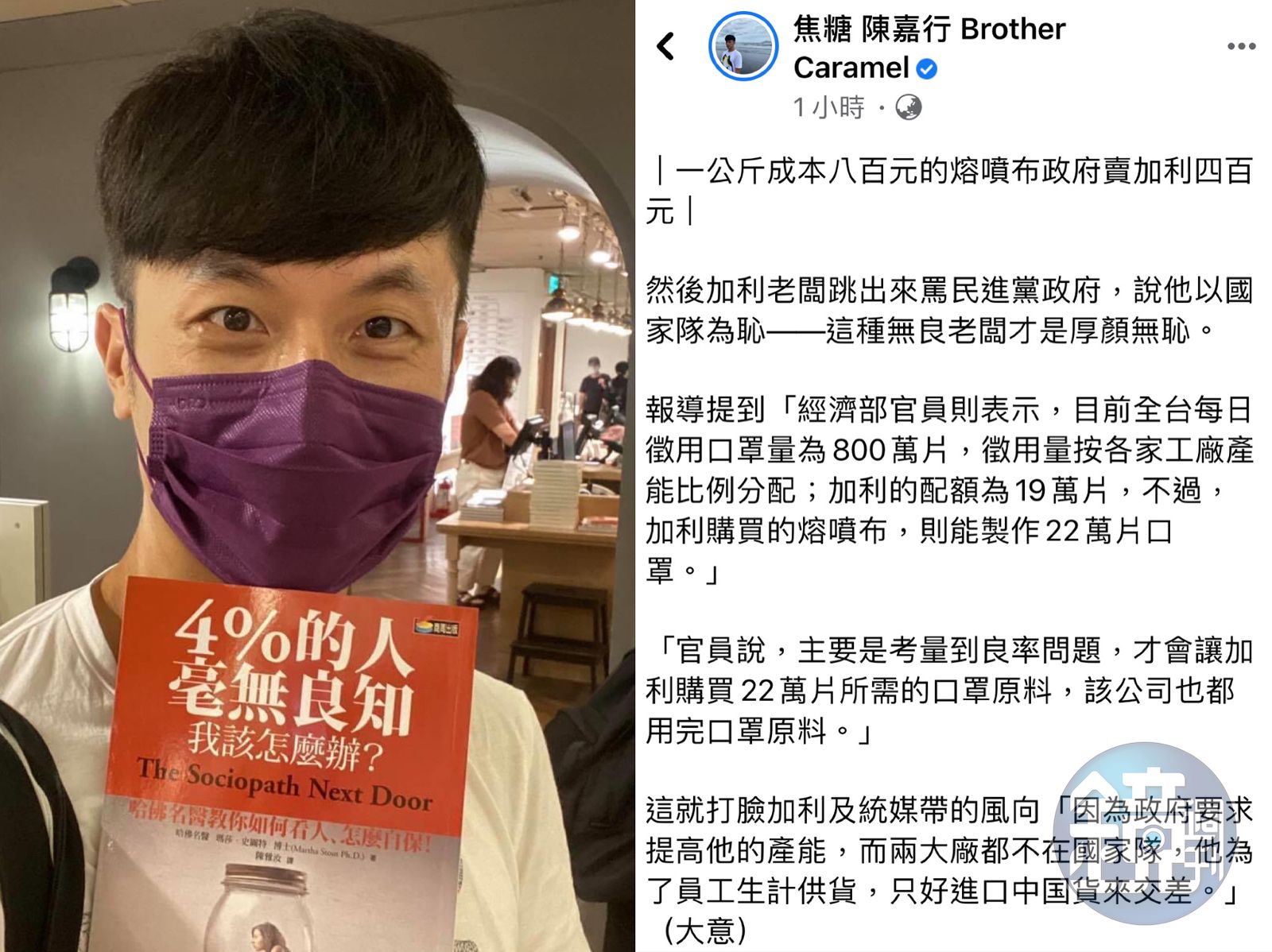 焦糖哥哥陳嘉行呼籲政府查清楚是否還有不肖商人販賣黑心口罩。(圖/翻攝自陳嘉行臉書)對此,平時很關心時事的「焦糖哥哥」陳嘉行看不下去,也跳出來怒批林明進「厚顏無恥」,「他不知道如果台灣跟其他國家一樣疫情失控,他的黑心口罩會讓更多人死於非命嗎?」陳嘉行也呼籲政府除了要徹查嚴辦,也要查清楚還有沒有不肖商人跟加利一樣販賣黑心口罩。