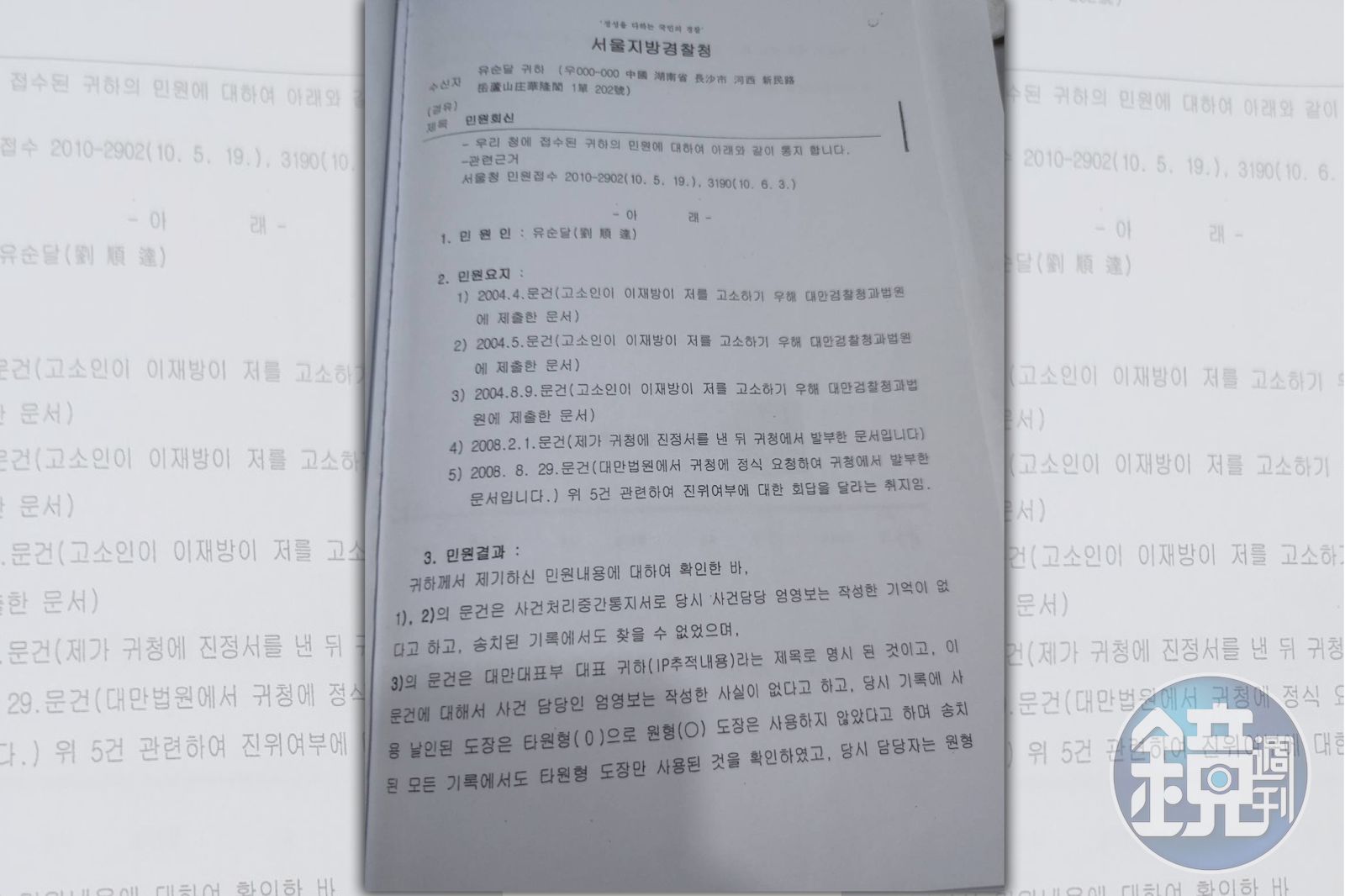 劉順達提出證據反控,指李在方所提的韓國首爾地方警察廳的調查文件,竟有2種不同版本,在第一種版本中,韓國警方證實承辦員警並無製作筆錄;第二種版本,不僅承辦員警必須蓋印的印章處空白,且李在方還在報告上親筆書寫「漢城地方警察外事3系担当嚴」字樣,台北地檢署卻根據李所提供的這份疑似偽造的證據將其起訴。