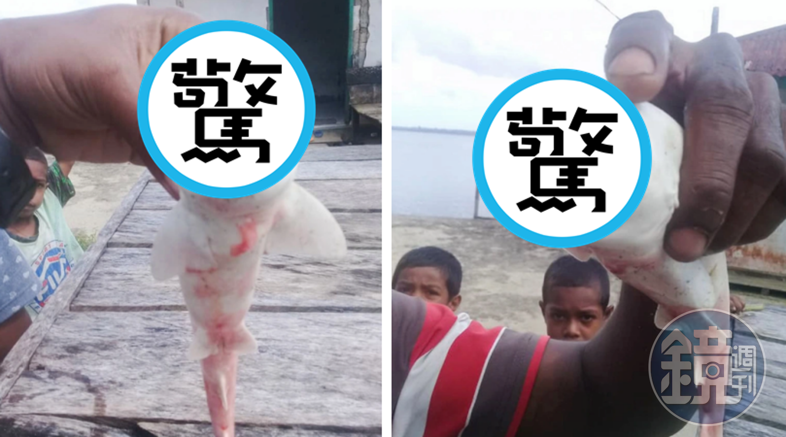 根據英國《太陽報》報導,印尼漁民捕獲一隻已經懷孕的母鯊,要將其內臟取出時發現母鯊的子宮內還有3隻小鯊魚,不過都已經死亡,且其中一隻非常奇怪,只有一隻眼睛長在額頭正中間,像是希臘神話裡的獨眼巨人(cyclops),顏色也是相當罕見的乳白色。 當地的海洋相關單位也對這隻尚未出生的動物進行檢驗,確認牠真的是鯊魚,也證實牠患有罕見的前腦發育畸形症,導致眼眶沒有成功分裂成兩處,此種疾病通常也會導致流產或是死胎。此外它也患有白化症,因此才產生奇特的乳白色。