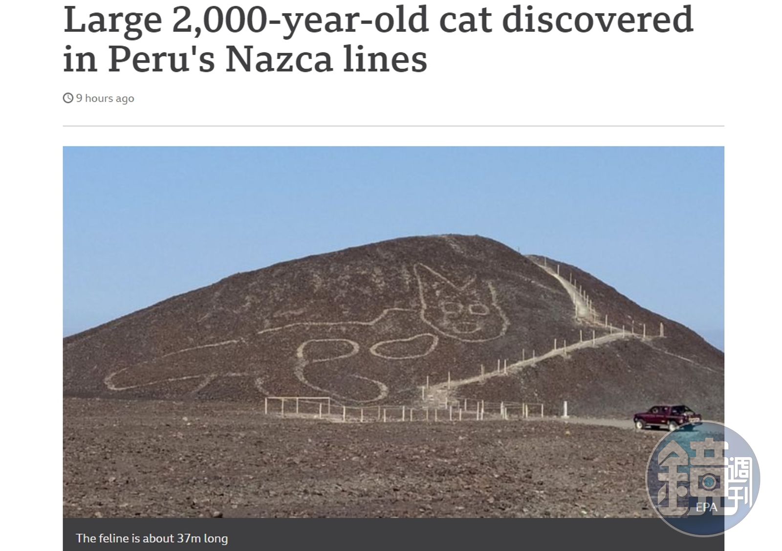 最近秘魯文化部宣布,他們在納斯卡沙漠中發現了一隻「千年巨貓」,這隻巨貓過去並沒有受到注意,直到最近當局要制定通往觀察平台的新路徑,才意外發現它的存在。它和其他納斯卡線一樣,是在沙漠地面上形成的凹陷使有色土讓裸露而成。