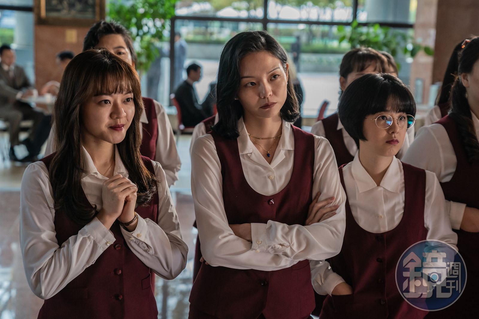 高我星(左起)、李絮、朴惠秀在新片《菜英文沒在怕》飾演90年代力求升遷的OL,因發現公司不當行為而決定奮力對抗。(車庫娛樂提供)發布時間:2020.10.22 18:10 臺北時間