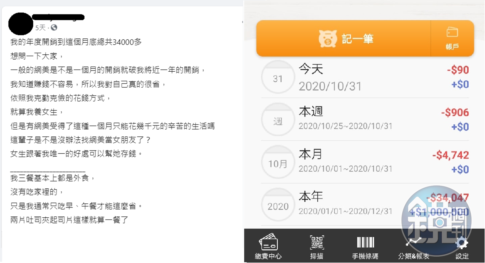 1名自稱克勤克儉的男網友在臉書社團「戀愛公社」發問,他統整了自己的年度花費,2020年至今他只花了3萬4千多元,但他在意的居然是:一般網美1個月開銷是否就超過他10個月的花費。原PO又詢問,就算他願意養,有網美受得了一個月只能花幾千元的辛苦生活嗎?