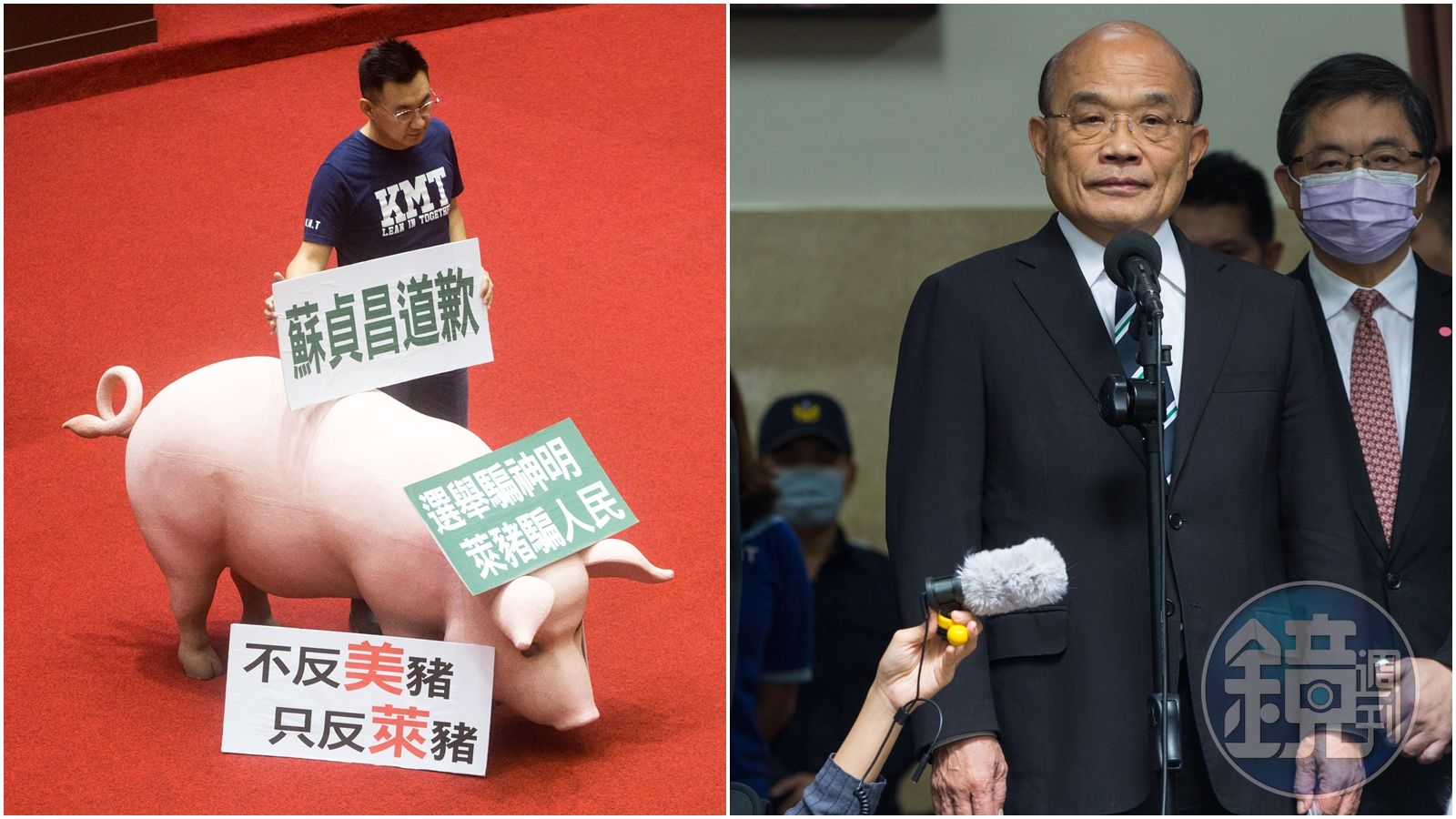 國民黨團數度抬出粉紅豬隻裝置藝術進議場杯葛蘇貞昌(右)報告與接受備詢。(本刊資料照)發布時間:2020.11.10 10:43 臺北時間