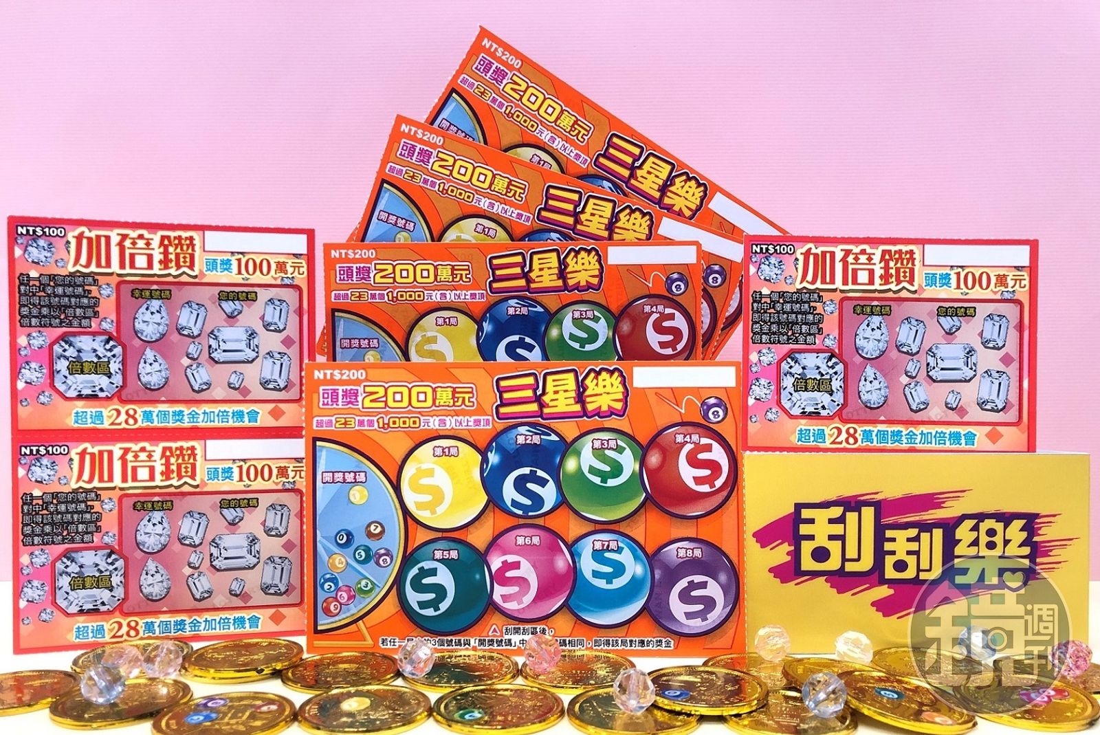 刮刮樂再推新玩法!台灣彩券公司昨(17日)推出全新主題刮刮樂「三星樂」,採用電腦型遊戲「3星彩」部分遊戲規則,與刮刮樂深受消費者喜愛的「對幸運號碼」玩法結合,紙上即時體驗刮中3星得獎金的樂趣;同日還推出每張售價100元刮刮樂「加倍鑽」,2款新品總獎項超過225萬個,總獎金逾7億元。