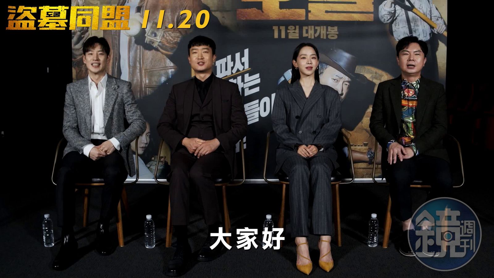 《盜墓同盟》即將在台上映,演員李帝勳(左起)、趙宇鎮、申惠善、林元熙以中文向台灣觀眾問好。(龍祥電影提供)發布時間:2020.11.19 15:05 臺北時間