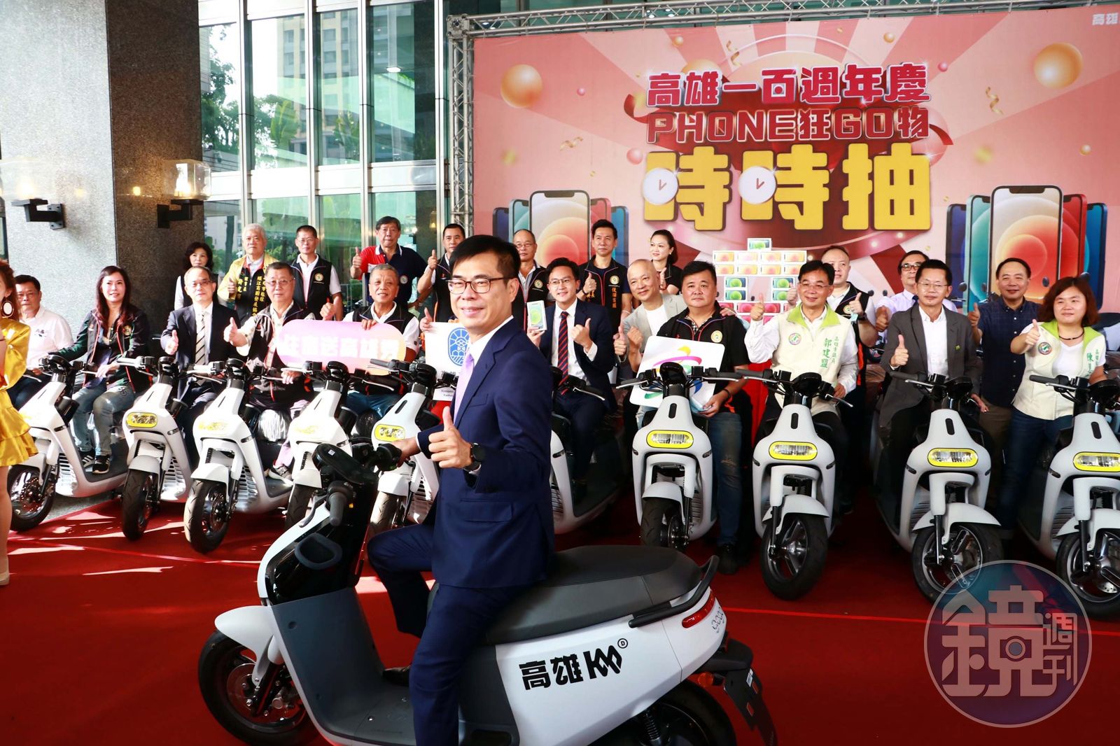 高雄市長陳其邁昨(23日)在記者會表示,正值百貨公司週年慶,今年正是高雄100年,規模當然是100倍,使用三倍券、現金消費就可以參加抽獎,到配合活動的高雄飯店住宿,立刻贈送400元高雄券,喊話要大家趕緊到高雄消費。記者會現場展示Gogoro電動車和新款iPhone,12月每天將抽出3台電動車、每2小時抽出手機。