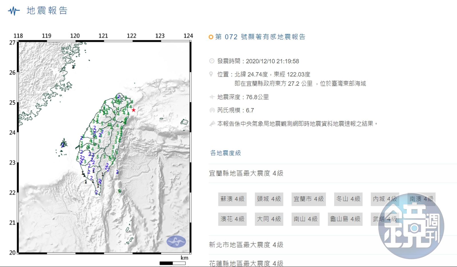 根據氣象局資料顯示,東北地區附近發生有感地震,宜蘭縣、台北市、新北市、桃園市、新竹縣、南投縣、台中市、苗栗縣、雲林縣及嘉義縣最大震度達4級;基隆市、新竹市、台東縣、彰化縣、嘉義市、高雄市及台南市則為3級;屏東縣及澎湖縣2級;連江縣1級。