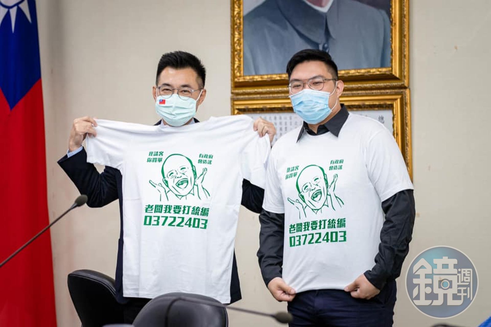 國民黨青年黨團團長陳柏翰以及前團長田方倫、蕭敬嚴,今天在國民黨中央發表行政院統編潮T,T恤上大大印著蘇貞昌開心張手圖案,下方文字寫著:「老闆我要打統編03722403」。