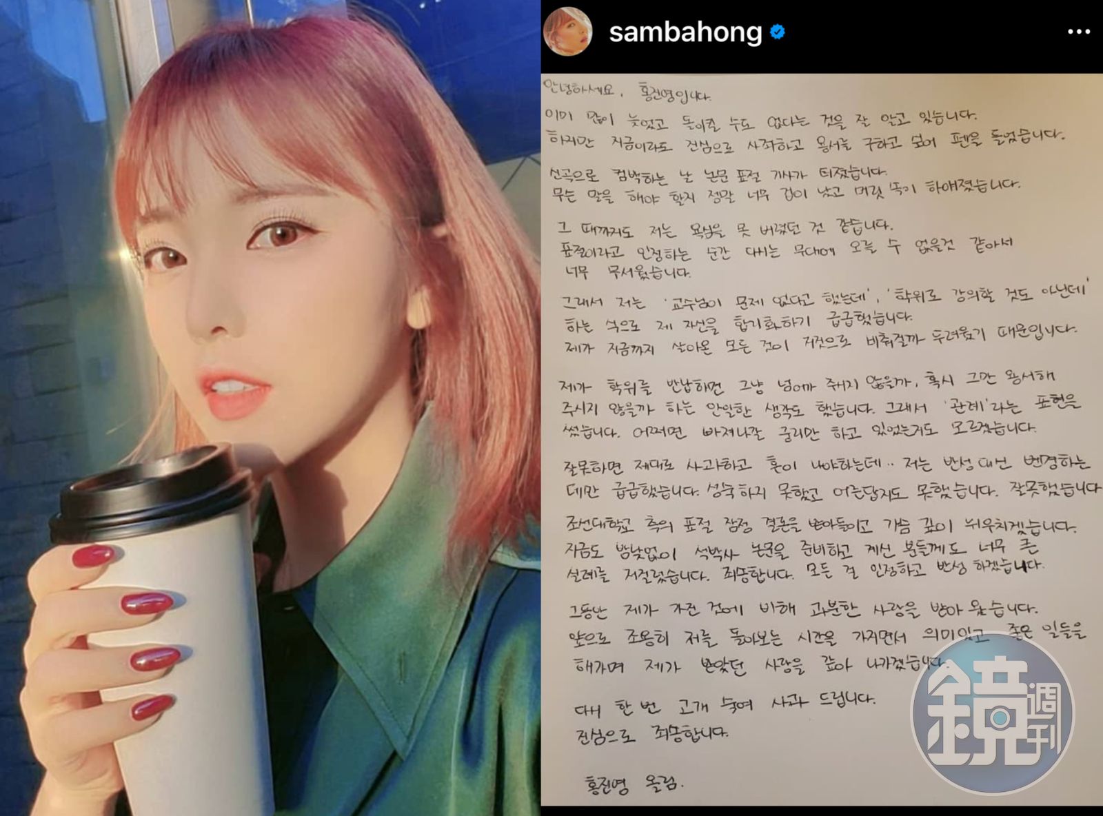 洪真英對於剽竊論文一事向大眾致歉,坦言自己在事發時不敢直接承認就怕失去表演舞台。(翻攝自洪真英IG)發布時間:2020.12.25 17:15 臺北時間