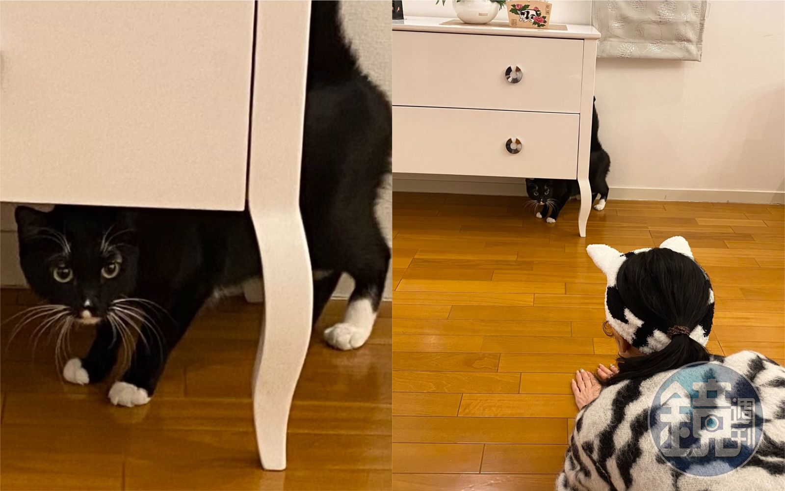 藤彩子在推特上發文,曬出穿上乳牛裝模仿貓咪躺姿的照片,她也趴在地上試圖親近家中貓咪,孰料愛貓似乎認不出自己,還全身豎起毛來躲在櫃子底下,絲毫不給主人面子。